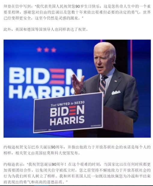 而拜登的电文“对自由的忠诚”,“艰难但必要决定的勇气”,这句话恐怕特朗普不会这么说,而在大势不妙的今天,这句话也不仅仅是说给戈尔巴乔夫听的。至于是不是如拜登所说,“世界已经变得更安全”,纵观当代风云,这可真就不好说了。