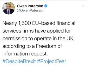 近1500欧盟金融机构申请在英国的经营授权(来源:推特)