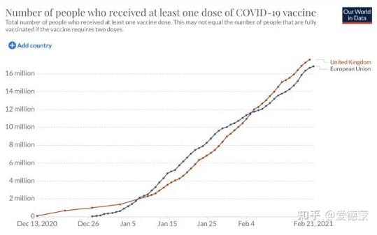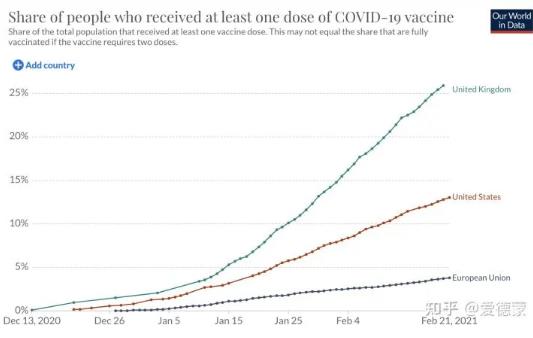另外,英国如今坐拥牛津疫苗,在2月21日已经给33%的成年人(注意!不是总人口)注射疫苗,而欧盟仅仅注射了5%的成年人。