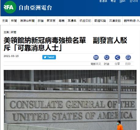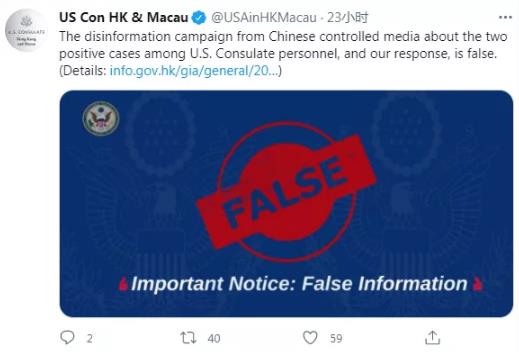 16日,美国驻香港总领馆在其Facebook及Twitter页面上写了一段文字。它声称,所谓两名领事馆职员拒绝隔离虚假消息来自大陆政府控制的媒体,是完全错误。