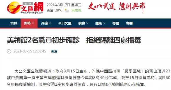 不过,港媒随即就有爆料。点新闻、大公文汇等多家港媒援引“可靠消息人士”的说法称,这两人以外交豁免权为由,拒绝接受隔离安排,目前仍如常在社区遊走和回美领事馆办公,给防疫抗疫工作带来巨大隐患。