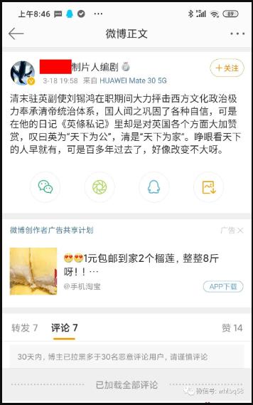 上面第一条微博已经被他删除了,但第二条还在。因为,第一条一发出来就被揭发与境外反华、轮子分子的腔调,特别是与卖国贼余茂春同调,遭到网友的痛批。而第二条内容看起来似乎没有什么不妥,但特别选在这个时候发,难道是要向网民普及历史知识?这种表面上阴阳怪气,实质上的隐射中国现在党和政府的伎俩,很快也遭到网民的怒怼,于是,他将怒对他的网民拉黑,并关闭的回复功能。