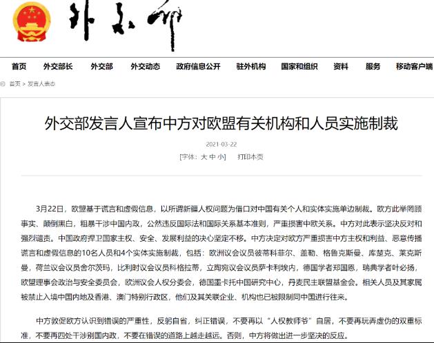 欧盟制裁中国4个人和一家机构,结果中国在3月22日对欧盟的制裁加倍奉还!制裁欧盟10个人和4家机构!