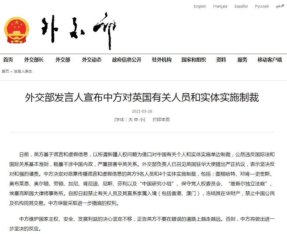 据外交部网站消息,当天外交部发言人宣布中方对英国有关人员和实体实施制裁。中方决定对恶意传播谎言和虚假信息的英方9名人员和4个实体实施制裁,包括:图根哈特、邓肯—史密斯、奥布莱恩、奥尔顿、劳顿、加尼、肯尼迪、尼斯、芬利以及“中国研究小组”、保守党人权委员会、“维吾尔独立法庭”、埃塞克斯园大律师事务所。自即日起禁止有关人员及其直系家属入境(包括香港、澳门),冻结其在华财产,禁止中国公民及机构同其交易。中方保留采取进一步措施的权利。