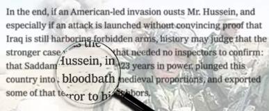 其实,早在2003年年初,在美军的授意下,美国媒体就开始为军事行动“造势”。《纽约时报》称萨达姆在其执政的23年期间,使伊拉克陷入中世纪般血腥的屠杀,还向邻国输出恐怖主义。