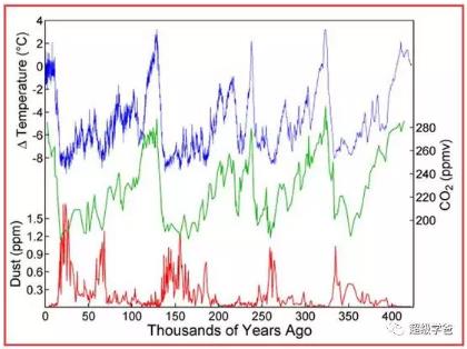 但问题是另外一些科学家们有另外的发现,他们发现地球气候变化是有周期规律的,就像春夏秋冬变化一样(看下图是不是很有规律)。这是在南极冰层检测出的过去45万年二氧化碳、温度和尘埃的变化。