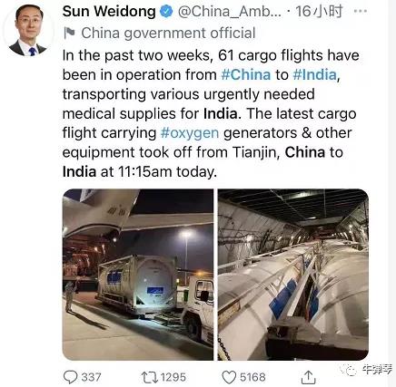 看了一下中国驻印度大使孙卫东的推特,5月1日的一条说:过去两周,共有61架次航班,载着各种急需的医疗物资,从中国飞到印度。最新的一架来自天津,载着制氧机等设备,今天中午抵达印度……