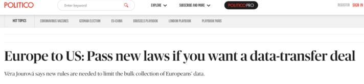 6月1日,也就是今天,欧盟委员会副主席说,如果华盛顿和布鲁塞尔要敲定一项关于跨大西洋传输人们数字信息的新协议,美国必须通过新的立法来限制其国家安全机构获取欧洲人数据的方式。