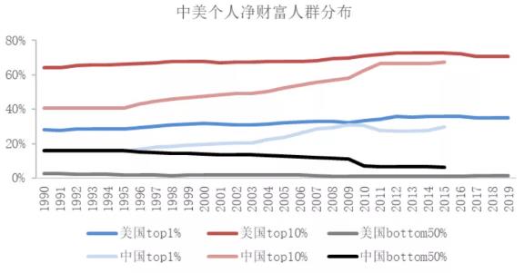 社会Top1%的人群中,美国逐步从1990年的个人净财富占据整个社会的28%上升到2019年的近35%。社会top10%的人群中,美国逐步从1990年的个人净财富占据整个社会的64%上升到2019年的近71%。而底层50%的人群拥有的个人净财富占比则越来越小,美国逐步从1990年的个人净财富占据整个社会的2.7%下降到2019年的近1.5%。