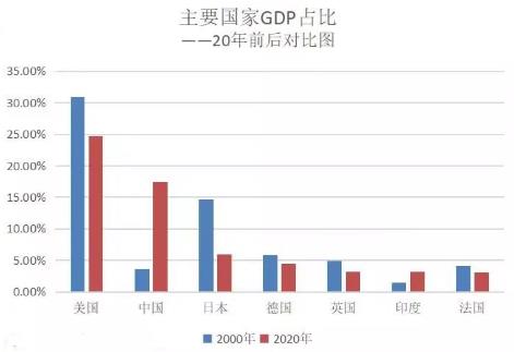 2000-2020年间,中国GDP占全球比重从不到4%提到高了将近18%,而一直领先的美国,GDP占全球比重从30.91%下降到了24.77%。