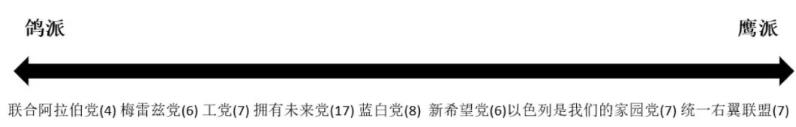 若按经济政策及巴以问题的立场来划分,其内部政治光谱大概如下图所示(括号里的数字表示内阁席位数)。