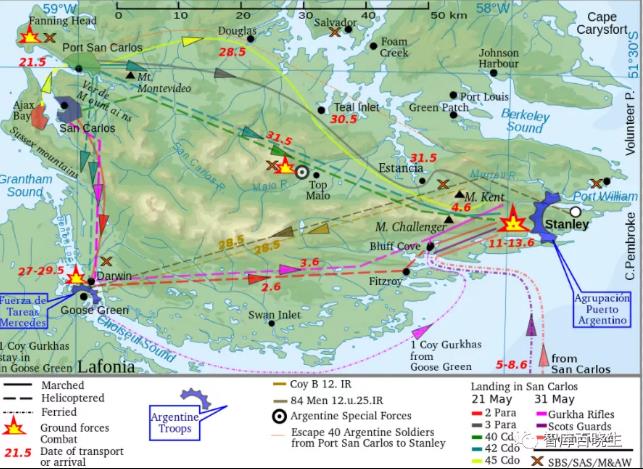 我找到了一张当时马岛战争地面攻击路线。