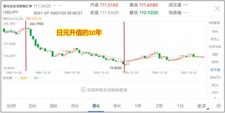 1985年,美国逼迫日本签订《广场协议》,要求日元兑美元升值。