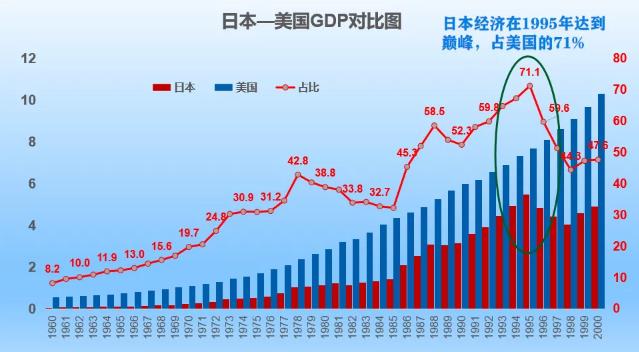 在美国技术和资金的支持下,日本的产业得到飞速的发展,在1995年的时候,日本经济达到巅峰,GDP达到了美国的71%。