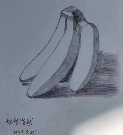 在学画的过程中,我亲眼见到了她前期的焦虑和无所适从,比如有经验的人几下勾出轮廓,但是妈妈要磨个一整天,最开始画的香蕉(下图),我看着和土豆块也差不多。