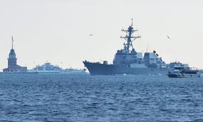 2014年3月7日,美国海军“特拉克斯顿”号导弹驱逐舰在位于土耳其伊斯坦布尔的博斯普鲁斯海峡上航行,准备进入黑海海域。图|新华社