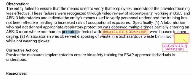 譬如,在披露的违规列表中,就有一项“严重违规”的行为,即人员在没有进行呼吸保护的情况下多次进入一间实验室,而当时室内其他人正在对动物进行手术,而那些已经感染病毒的动物则被简单关在笼子里。与此同时,一些工作人员在处理生物危害性废物时根本不佩戴手套······另外,实验室建筑物外表没密封,天花板和生物安全柜都有裂缝,人员在执行生物安全和控制措施时出现“系统性失败”……然而,美国疾控中心以“国家安全”为由拒绝公布更多细节。