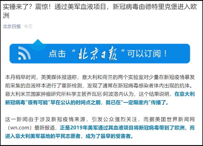 那么,这个病毒怎么来的呢?美国世界新闻最新报道给的结论是:2019年美军是通过血液项目将新冠病毒率先带到欧洲,从而进入意大利的美军基地的平民志愿者,从而将病毒传播出去的。这一结论,和去年就曝光的意大利可能最早是在2019年9月出现新冠病例的时间点完全吻合。