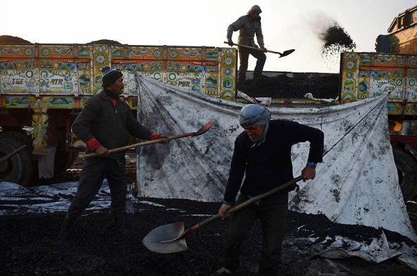 2019年1月8日,阿富首都汗喀布尔,工人在铲煤。