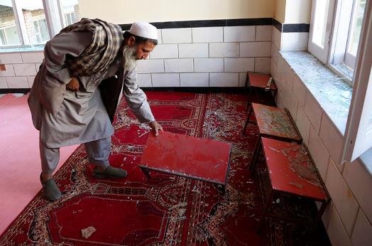 2021年5月14日,阿富汗首都喀布尔北部郊区的一座清真寺,一名男子在清理遇袭后的现场。图|新华社