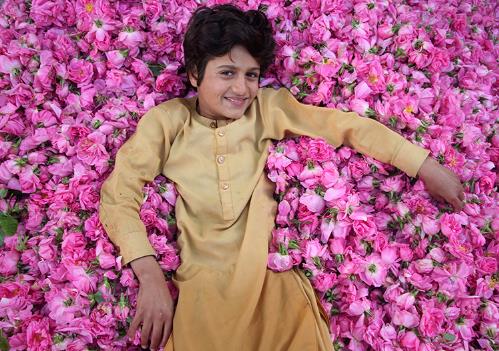 2021年4月18日,阿富汗楠格哈尔省,一名儿童躺在被采下的玫瑰花中。图|新华社