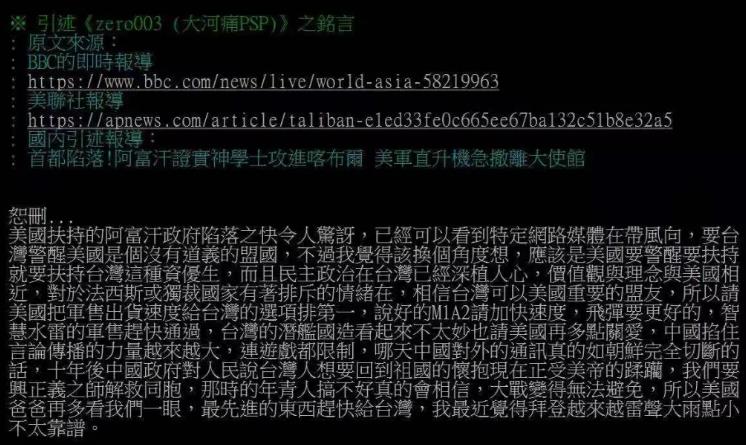 阿富汗的失败,是美国自身的失败,他已经没有办法再维持过去那种漫长的战线和强大的攻势,无论对中亚,还是对东亚都是这样。但在最后,我们还要一个问题,倒是值得谈一下,这和台湾有关。