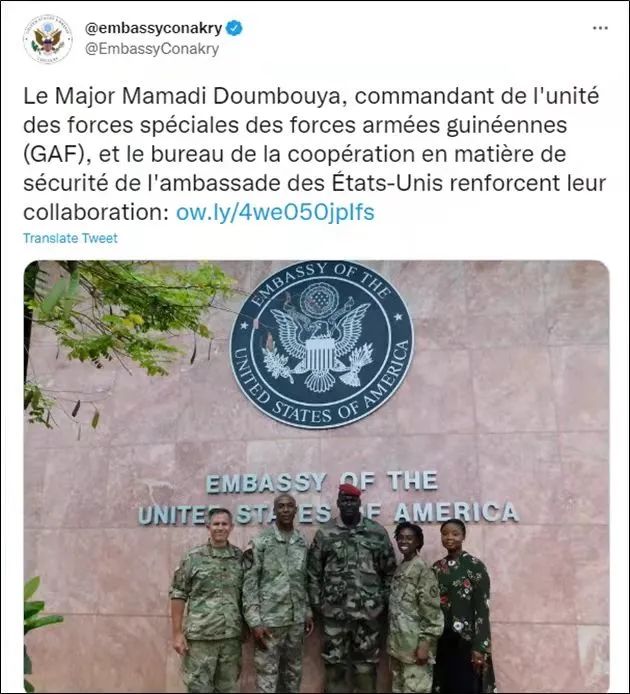 与此同时,根据环球时报转引外媒的报道,政变当天社交媒体就开始疯传一张照片,照片中是政变上校杜姆布亚和美国军官在美国大使馆门前的一张合影,发文者称这次政变背后有美国的“影子”。披露者声称,不但杜姆布亚接受过法国和美国的训练,而是参与这次政变的特战队员都曾在布基纳法索军事基地接受法国和美国军队的训练。换句话说,几内亚这支特种部队是法国和美国训练的,无论指挥官还是参与政变的特种兵,全都经过美军和法军的训练。