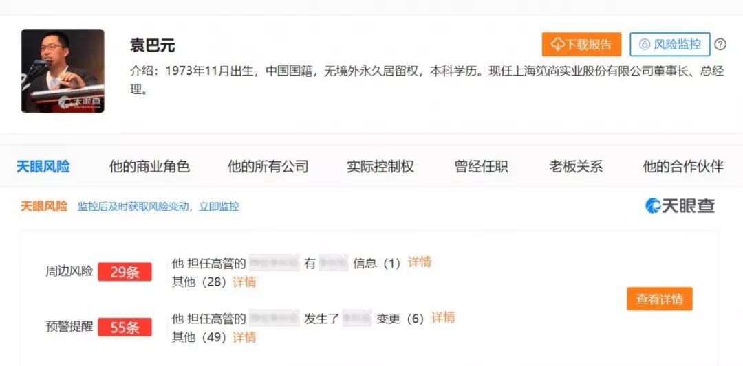 以张雨绮为例,她最近的一段婚姻失败,其实跟没有做好婚前调查有很大的关系。比如袁巴元这个人的所有信息,其实都可以用商业安全工具“X眼查”来查询得到,以下是“X眼查”上袁巴元老板详情页的截图,信息应有尽有。