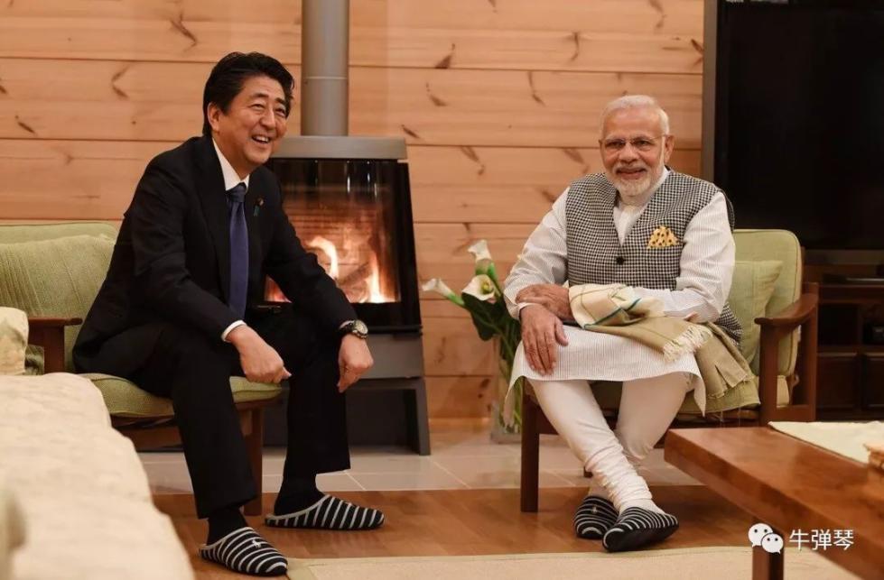 一张照片显示,白色的莫迪,黑色的安倍,坐在壁炉前,都穿着条纹拖鞋,脸上堆满了笑容,后面的炉火正稍得很旺……