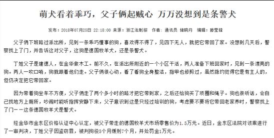 而实际上,这条警犬不是第一次“被盗窃”了,仅仅一个月前,2018年5月31日,这条德国牧羊犬也是在路边,被丁某甲、丁某乙用“吹口哨、召唤”的方式“盗窃”回家中,然后被警方找上门,以盗窃罪被判拘役5个月,缓刑7个月,罚金10000元。