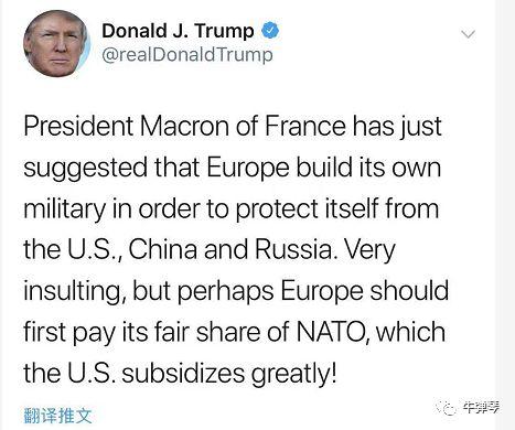 法国总统马克龙刚刚建议,欧洲应该建立自己的军队,保护自己不受美国、中国、俄罗斯的侵犯,非常侮辱人,但也许欧洲应该首先支付北约的合理费用,美国补贴得太多了!