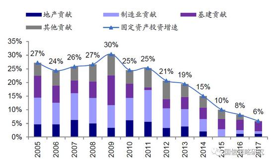 二是结构上看,固定资产投资构成从原先的地产、基建、制造业、其他相对均衡,变化为基建贡献一家独大,到2017年固定资产投资增速已经下降至个位数,而这其中绝大部分贡献来自于基建投资增速。