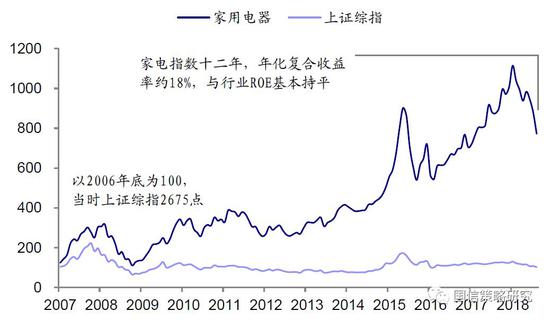 再细究一下数据的话,就会发现如果以2006年底为基准进行标准化,当时的上证综指点位是2675点与现在基本相当,到如今差不多十二年的时间,家电行业股价指数的年化复合收益率在18%左右,与行业的ROE基本相当。