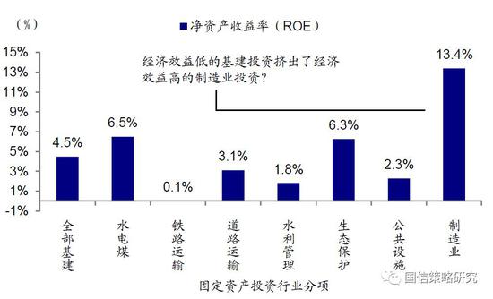 由于基建投资主体的国企背景,实际上基建投资占据了大量的金融资源,这意味着低经济效益的投资项目,对经济效益更高的制造业投资和服务业投资,产生了挤出效应。