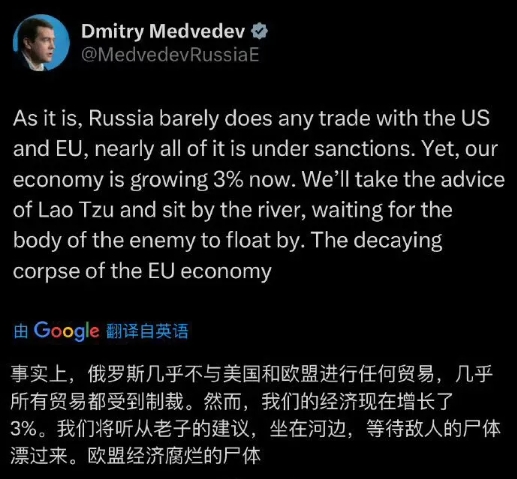 中国有句话,子在川上曰:“逝者如斯夫,不舍昼夜”。这句话经过梅德韦杰夫的“翻译”后,意思变成了:中国人的博弈方式是“坐在河边等敌人的尸体漂过来”,也就是坐等对手自己犯错。这话,你不能说完全没有道理,因为现在国际形势发展,还真有几分这样的味道。为什么会这么认为?我今天就说说这件事。