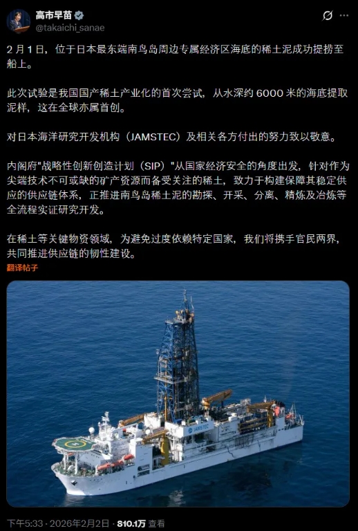 当下这个时间节点,高市早苗面临的,不只是对华关系压力,还有国内选举和对美姿态的双重考验。对内,她需要证明自己“有办法”应对中国的经济制裁;对外,她需要向美国展示,日本有“不可替代的”战略价值。深海稀土,恰好同时满足这两个需求;至于产业可行性,那是未来的事,甚至可以永远是未来的事。