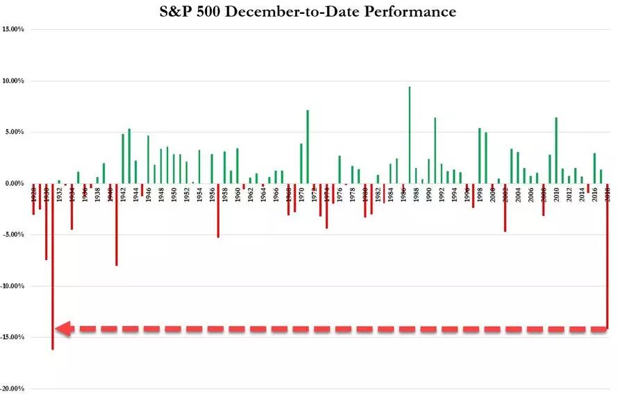 浓厚空头氛围延续到了本周,多头们痛苦地发现,标普500指数不仅遭遇了大萧条以来最惨烈的12月,甚至在平安夜收盘后悉数回吐了年初至今仅剩的最后一丁点涨幅,全年收益首次变成了负值。