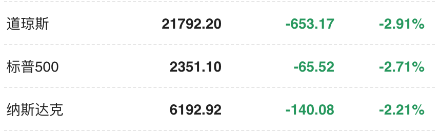 道琼斯工业平均指数大幅收跌653.17点,跌幅2.91%,报21792.20点,未能守住22000点整数位。该指数已经叩响了熊市的大门,就差临门一脚了。