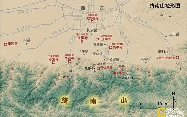从地理位置上说,终南山指的既是西安南面40公里处的终南山山峰,也指与之相邻的东西上百公里内的山峦,即秦岭的最北端。