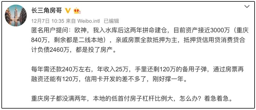 这样的人还不在少数,很多炒房团名声很大,他们帮用户做的事情就是不断加杠杆,比如怎么用信用卡套现凑首付,怎么更好的做资料通过银行房贷审核、怎么更好的做房产抵押等等,但技术再溜,也没法跟趋势作战,这些人要么找到可以覆盖房贷的自由现金流,要么认栽了事。