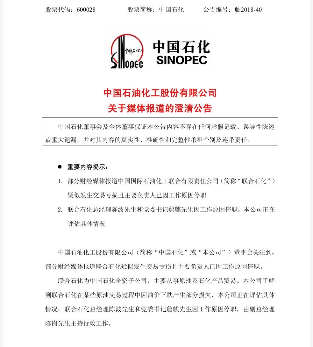 中石化公告说,其全资子公司联合石化在某些原油交易过程中因油价下跌产生部分损失。