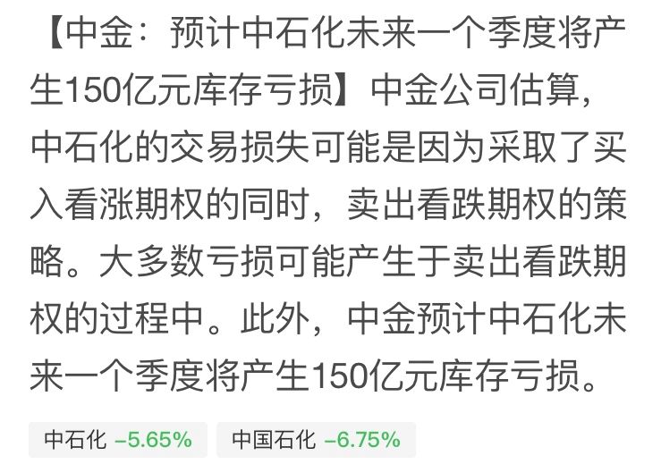 中金估算,中石化大多数亏损可能产生于卖出看跌期权的过程中。消息曝光后,中石化两日暴跌超10%,超500亿市值灰飞烟灭。