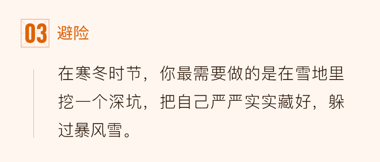 打个比方,在寒冬时节,你最需要做的是在雪地里挖一个深坑,把自己严严实实藏好,躲过暴风雪。相反,在这个时候如果选择来到地面野蛮生长,被冻成冰棍的概率就比较高了。