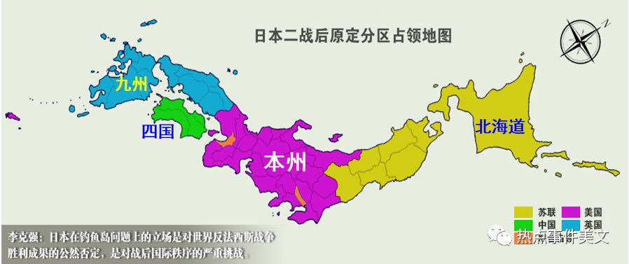 东北亚的日本是二战战败国,按照当初的设定,应该有中美俄英法共同管理:按照战后协议,日本应有战胜国在其驻军,具体划分是美国占领本州、英国占领九州、中国占领四国,苏联战略北海道。