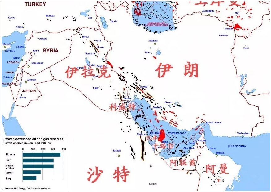大家看看中东的石油和天然气的分布:石油和天然气主要分布波斯湾附近的沙特、伊朗、卡塔尔、伊拉克等国家,叙利亚并没有什么石油和天然气(红色的为气田,黑色为油田)。