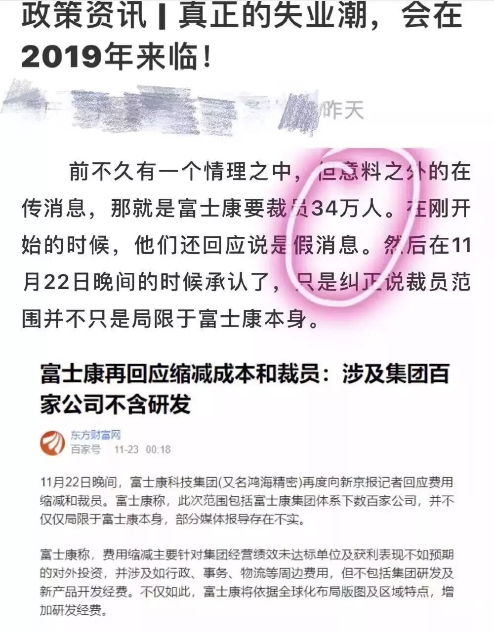 群里还有人爆料说,富士康裁员34万人。