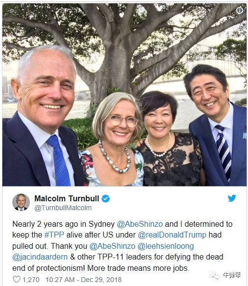 很有意思的是,在CPTTP生效的当天,已经下台的澳大利亚前总理特恩布尔发了一条推特,还特意@了一下特朗普。他是这样说的: