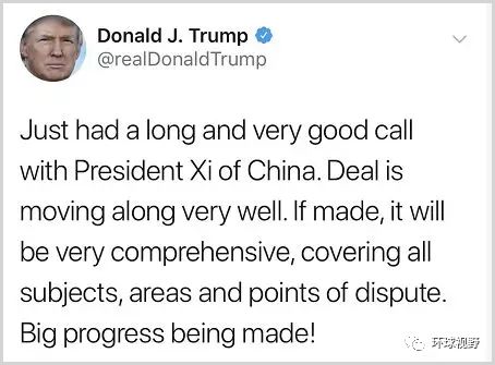同样,在30日,川普在推特上也用了一系列关键词“长时间良好通话”、“谈判进展顺利”、“重大进展正在取得”。