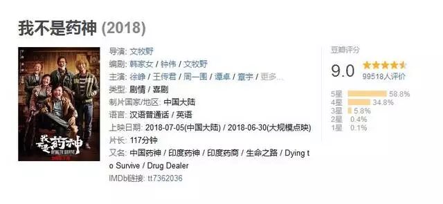 2018年7月5日,一部划时代的神片——《我不是药神》上映。刚上映半天,它被誉为二十年才出现一回的华语豆瓣九分神片。上一部华语9分片,还是十六年前,梁朝伟和刘德华主演的《无间道》。