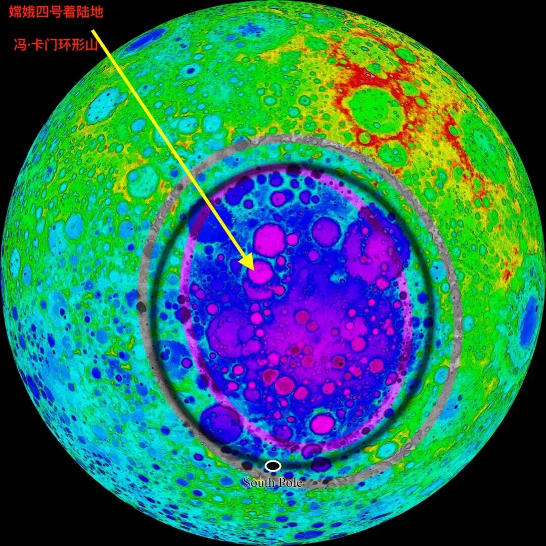 c. 嫦娥四号实际着陆地点位于该区域中部的冯·卡门环形山,它以钱学森的恩师的名字命名。这里经过了强烈碰撞,极可能曾经被熔岩淹没,各类物质含量丰富,或许留有月幔最原始的成分,保留了月球最深层的秘密;